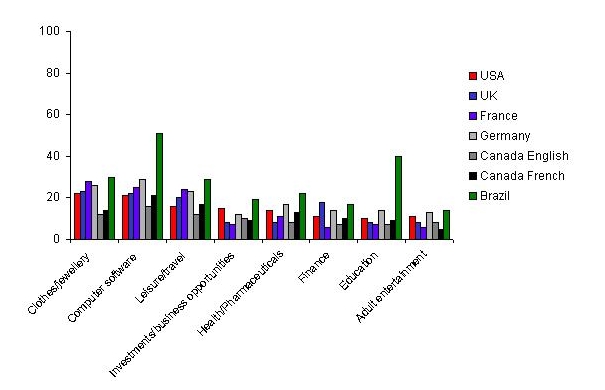 Percentage of online consumers that have purchased items from spam broken down by country and item purchased